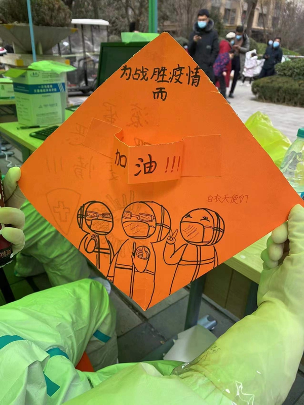 “這是小朋友送來(lái)的手工賀卡。因?yàn)槊看巫龊怂岬倪^(guò)程中,手上要不停噴酒精,做一個(gè)噴一,居民灌了好幾大桶熱水給我們暖手……”在郭杜街道書香路社區(qū),配合完成5500位常駐居民核酸采樣的新型能源公司鄭智超,感動(dòng)地說(shuō):“能夠與這么一群優(yōu)秀的醫(yī)務(wù)工作者一起戰(zhàn)斗倍感榮幸,我會(huì)做好防疫工作,為我們共同熱愛(ài)的城市貢獻(xiàn)一份陜煤力量。”