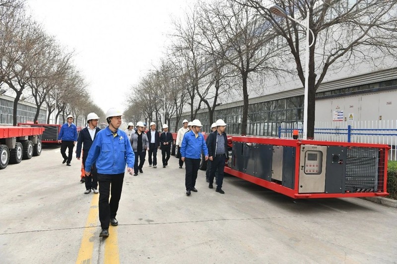 肖宇寧一行參觀了公司的裝配、電液、機(jī)加工、鉚焊、涂裝等生產(chǎn)車間,實(shí)地考察了192軸線模塊車的生產(chǎn)流程,并聽取了項(xiàng)目負(fù)責(zé)人關(guān)于產(chǎn)品設(shè)計(jì)、制造工藝、性能參數(shù)等方面的詳盡匯報(bào)。