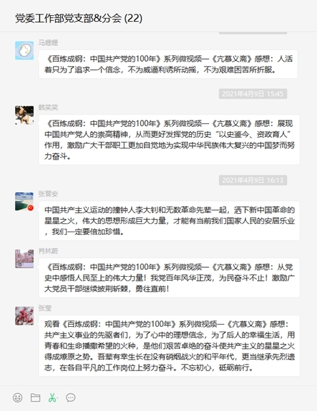黨史學(xué)習(xí)教育開展以來,陜建機(jī)股份公司黨委認(rèn)真組織,積極引導(dǎo),有序開展。在近日開展的系列學(xué)習(xí)中,《百煉成鋼:中國共產(chǎn)黨的100年》系列微視頻分享,黨的光榮傳統(tǒng)和優(yōu)良作風(fēng)引發(fā)了黨員干部職工熱議。 陜建機(jī)股份公司黨委工作部黨支部黨員李丹珍在收看《百煉成鋼》系列微視頻二《老漁陽里的秘密》后感慨談到:“這兩處看似尋常的石庫門建筑,卻與中共的誕生及初期活動(dòng)緊緊地維系在一起,“漁陽里”因此成為中國共產(chǎn)黨孕育初心之地、紅色征程原點(diǎn)。昔日風(fēng)雨搖曳里的漁陽里,今日化為不滅的民族精神。我們緬懷先烈...