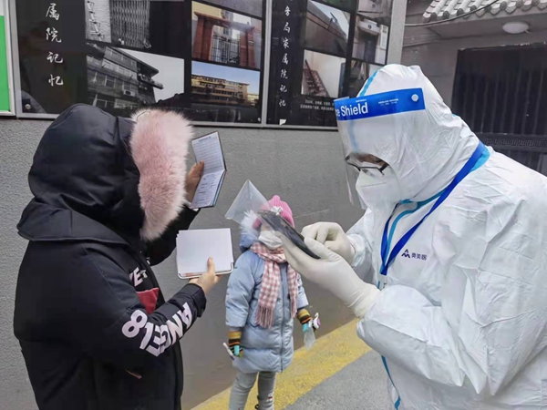 孩子年齡較小需手動(dòng)輸入、老人操作手機(jī)不方便,影響整體進(jìn)度,加之天氣寒冷,業(yè)主們都比較焦急,她輕聲細(xì)語(yǔ)、條理清晰地引導(dǎo)溝通。全天社區(qū)共采樣3160份,她本人服務(wù)1500余人,下班時(shí)防護(hù)衣已經(jīng)快粘在身上了,當(dāng)時(shí)只是感覺(jué)到很冷很口渴,十指已經(jīng)僵硬。