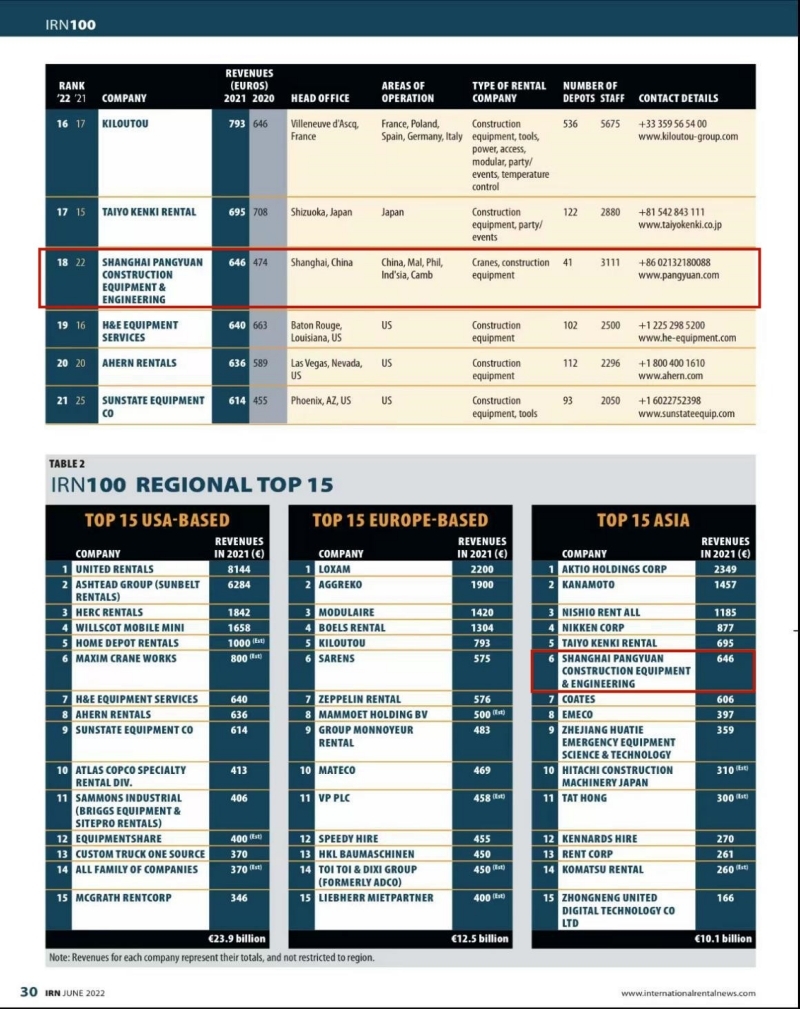 日前,國際知名行業(yè)評價機構(gòu)英國KHL集團向全球公布了2021年全球工程機械租賃百強榜-IRN100榜單,陜建機股份所屬上海龐源機械租賃有限公司(以下簡稱龐源租賃)以年度營業(yè)收入43.34億元位居全球排名第18位,較2020年上升4位,再創(chuàng)歷史新高。在全球區(qū)域榜單排名中,龐源租賃位居亞洲第6名,穩(wěn)居中國工程機械租賃行業(yè)第1名。 實至名歸 龐源租賃是進入建筑起重機械租賃行業(yè)較早的企業(yè)。2015年,陜建機股份以發(fā)行股份的形式,對龐源租賃進行了并購重組,重新整合優(yōu)化了產(chǎn)業(yè)結(jié)構(gòu),一舉打通了工程機械制造和租賃服務(wù)上下游供應(yīng)鏈,推動...
